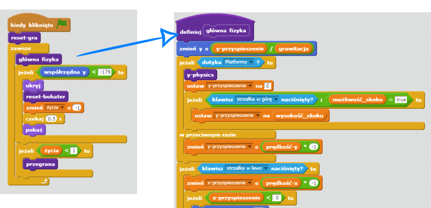 - Główna pętla gry - pętla zawsze wywołuje blok główna fizyka, który wykonuje wiele rzeczy! Gdy mamy je osobno skrypt jest przejrzystszy, bardziej czytelny i łatwiej zrozumieć co się kiedy dzieje nie martwiąc się jak to się dzieje.