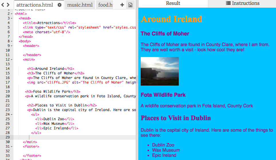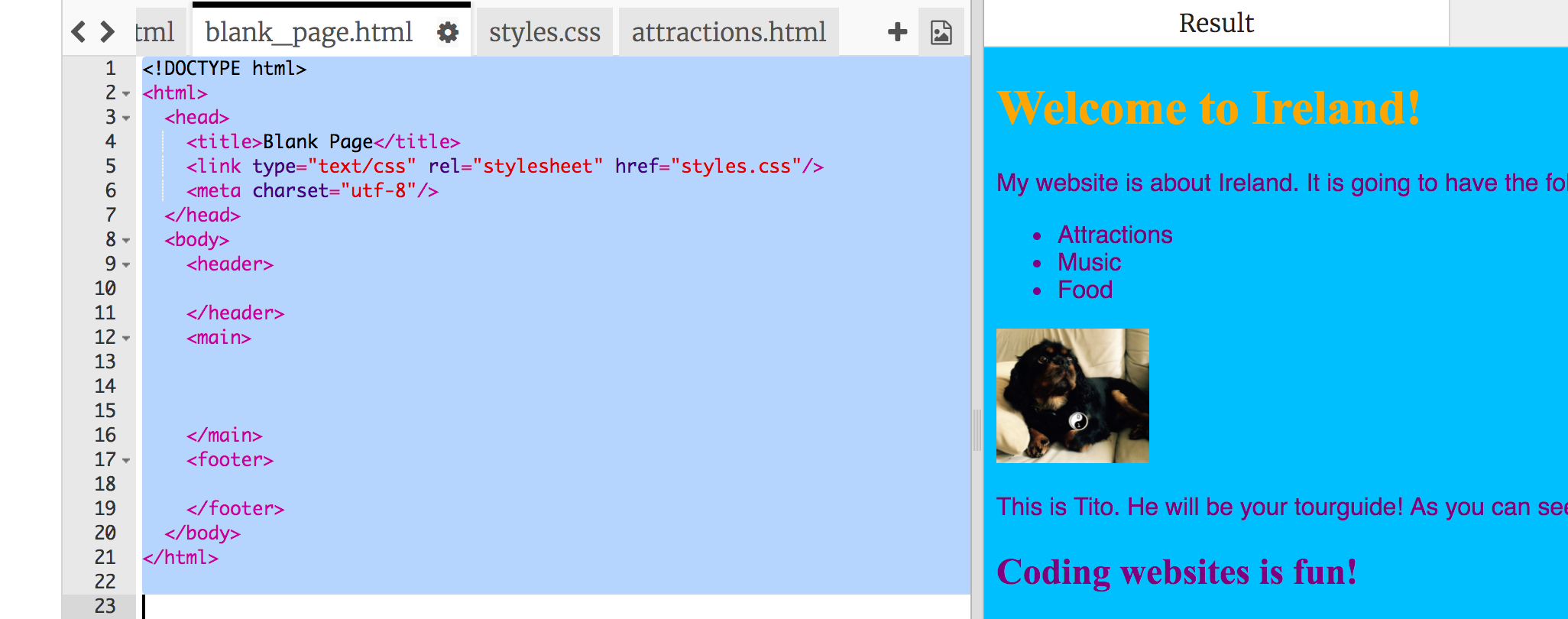 tags in the new file, use the tags you have learned to add stuff to the page, such as paragraphs, headings, images and lists! Repeat the steps above for each new page that you want to add.