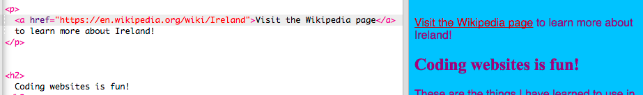 - Just like the other text, you can make links be any colour you like in the stylesheet. Go to the styles.css file and add the following set of rules. Notice the selector for links is