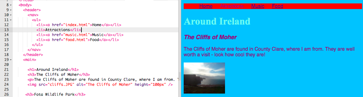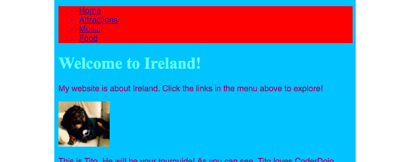 . Now go to each of your other files, and do the same thing, each time removing the link tags for the page you are editing. So on the music.html file, remove the link tags in the "Music" list item, and so on.